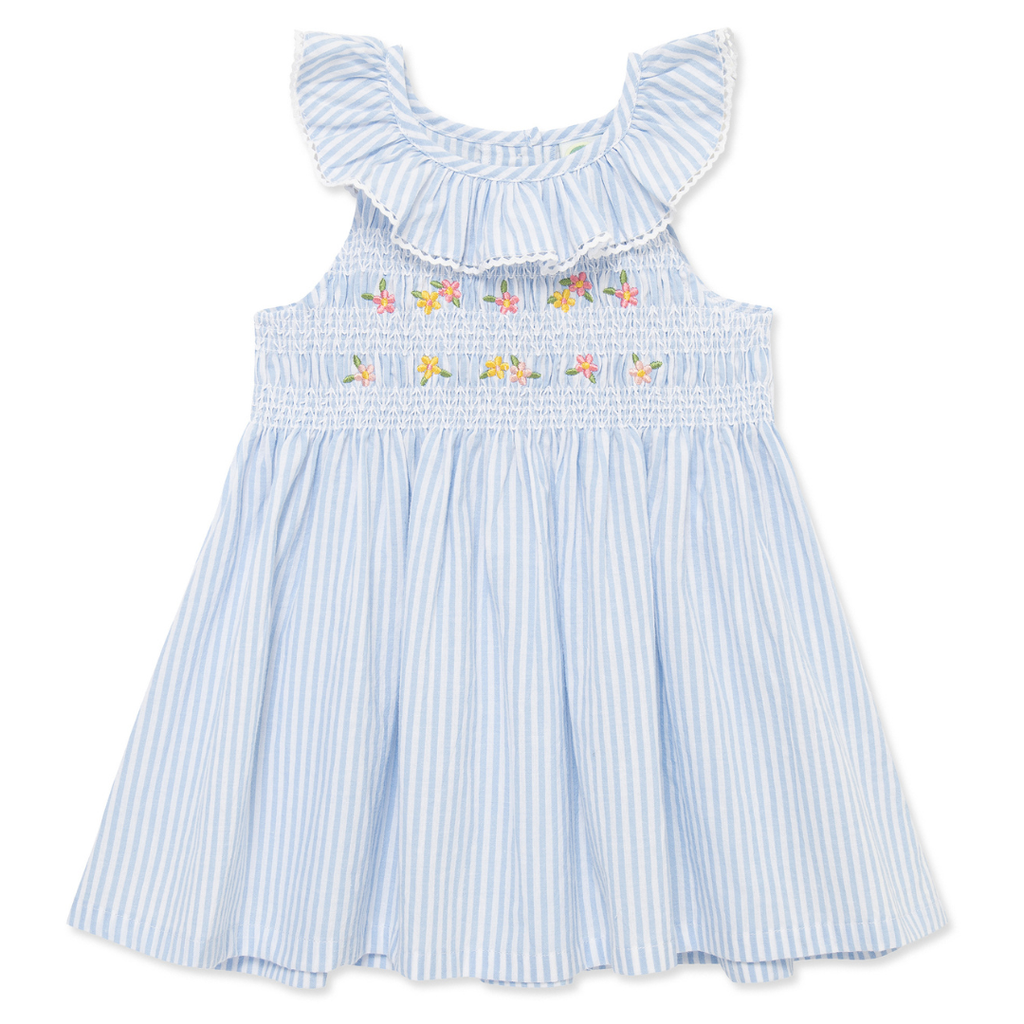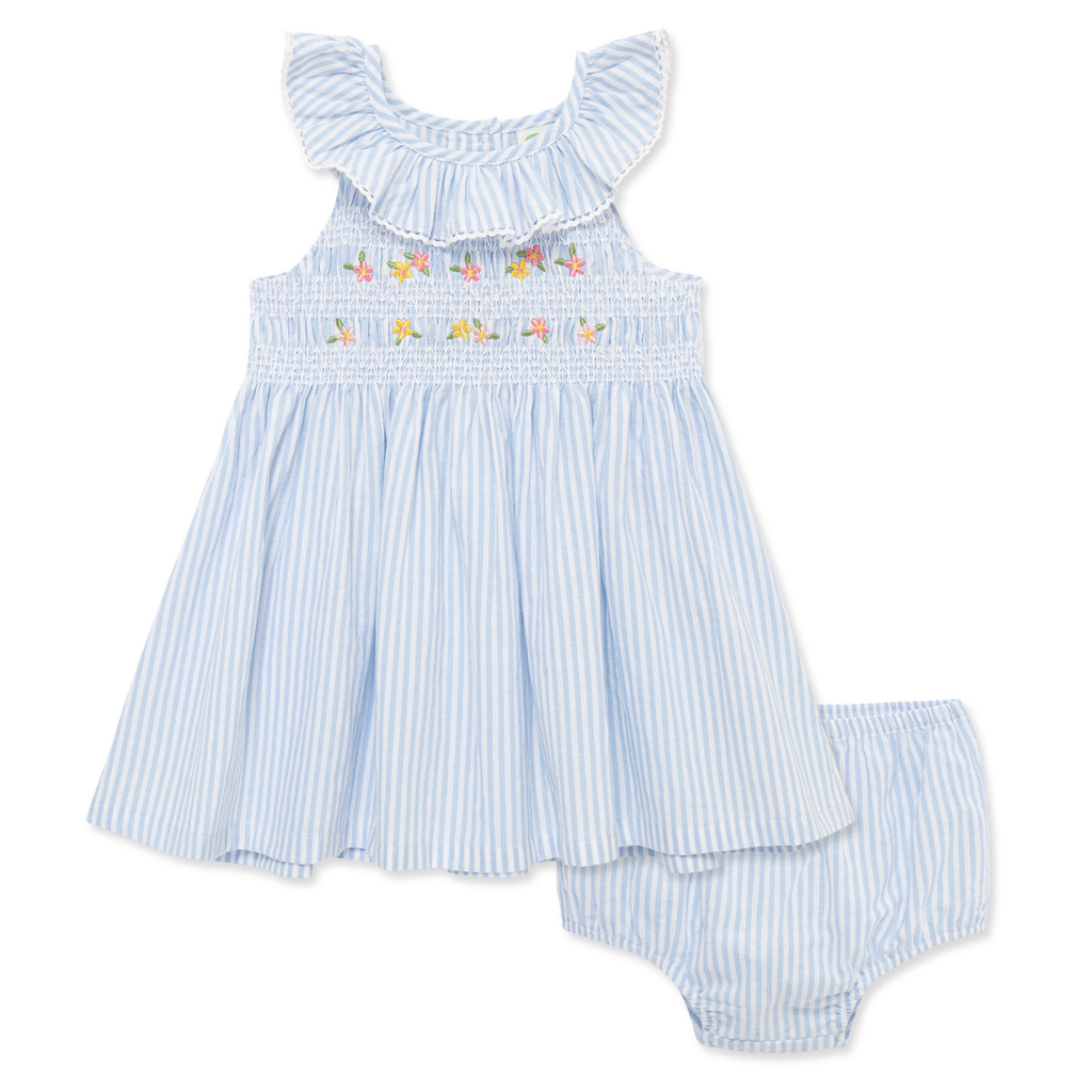 Features delicate smocking across the chest with embroidered pastel flowers for a timeless, heirloom-inspired look.