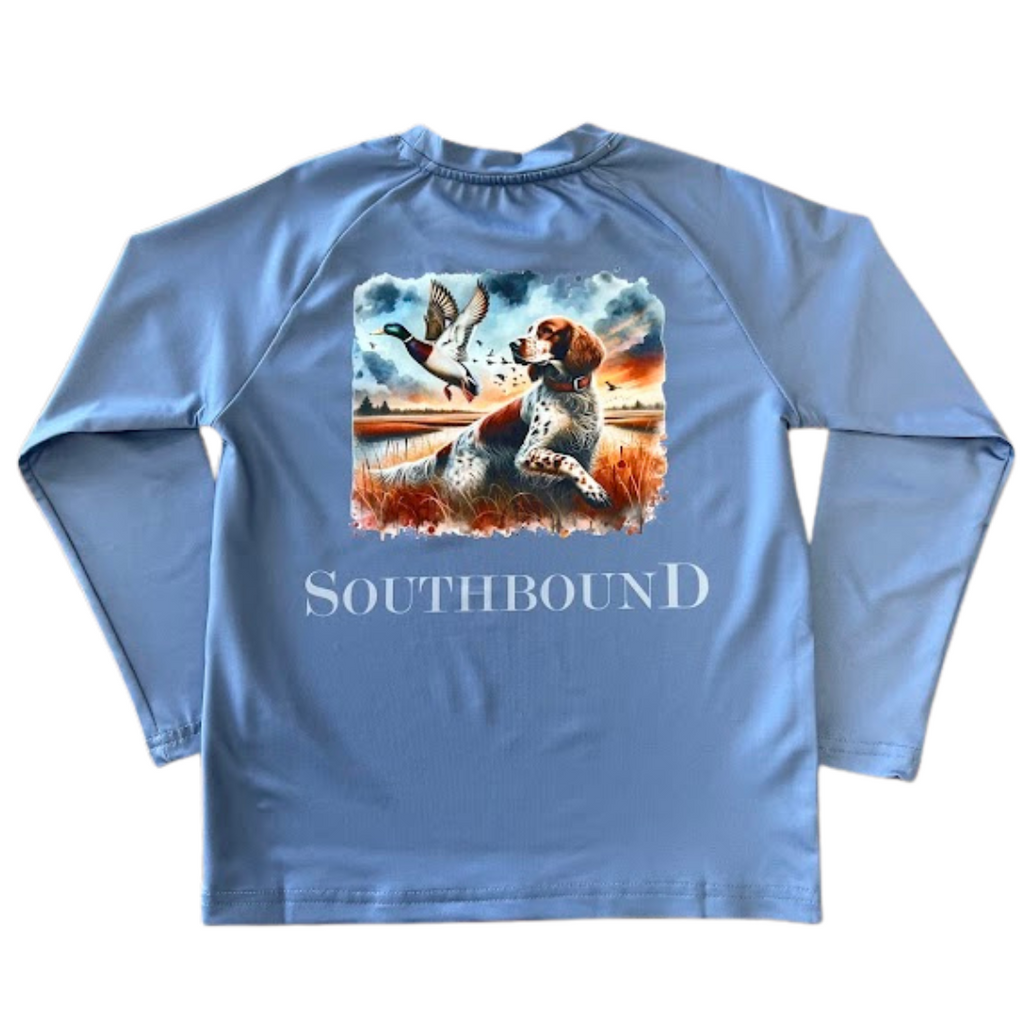 Long sleeve performance tee with bold hunting dog and duck artwork