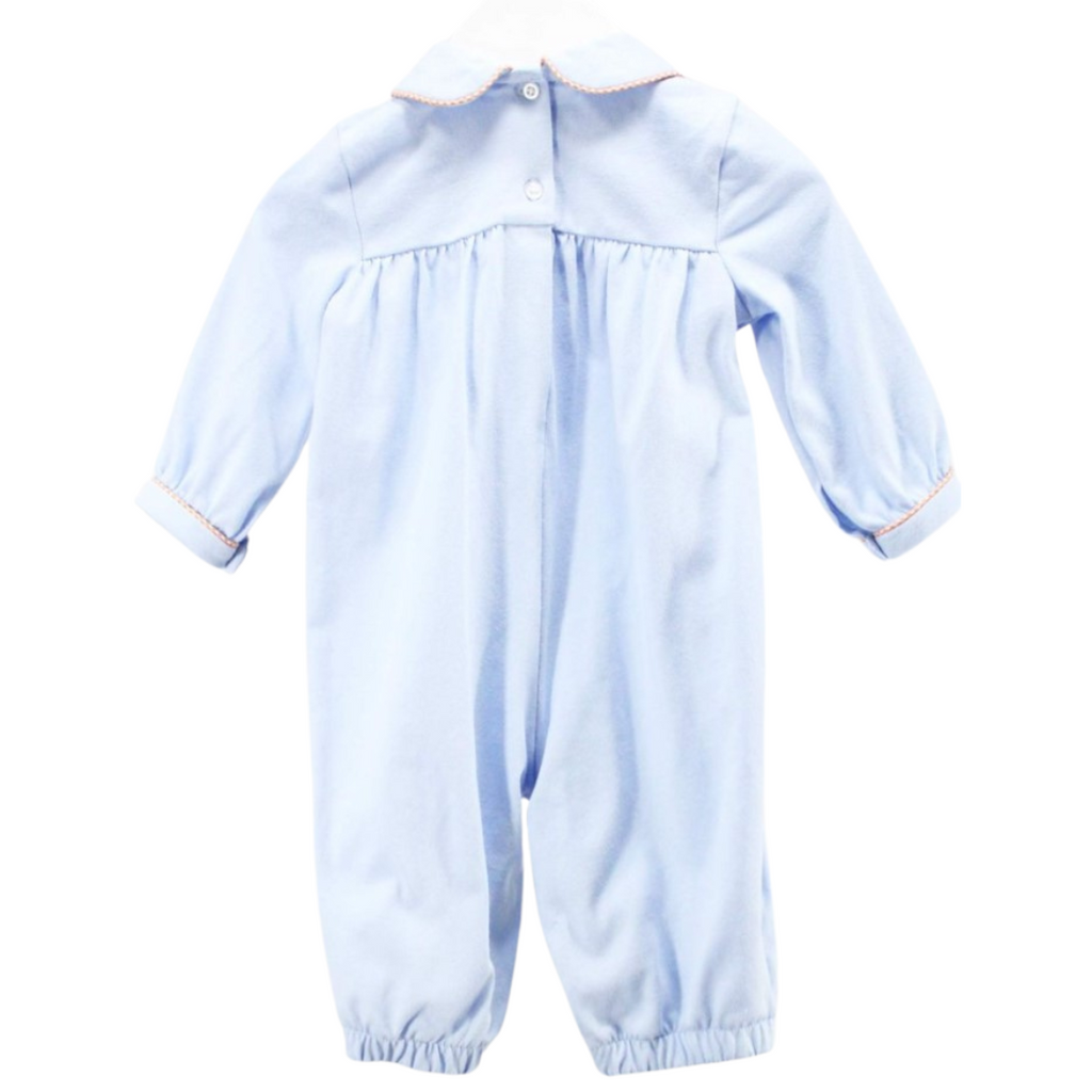 Light blue long sleeve romper with a rounded collar and stitched pumpkins on the front.