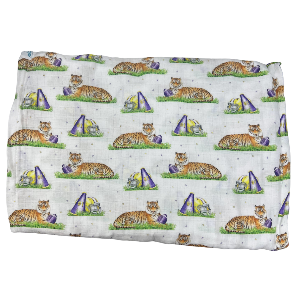 Mascot Mania Game Day Swaddle – LSU-inspired muslin swaddle featuring playful tiger mascots, football helmets, and purple megaphones for the tiniest Louisiana fans.