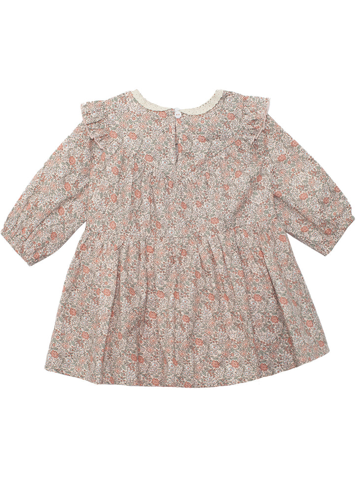 Soft floral print romper in warm earth tones with vintage-inspired ruffle trim