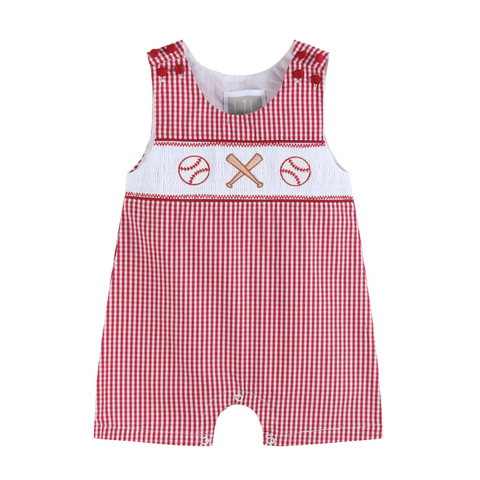 Red Gingham Baseball Smocked Shortall