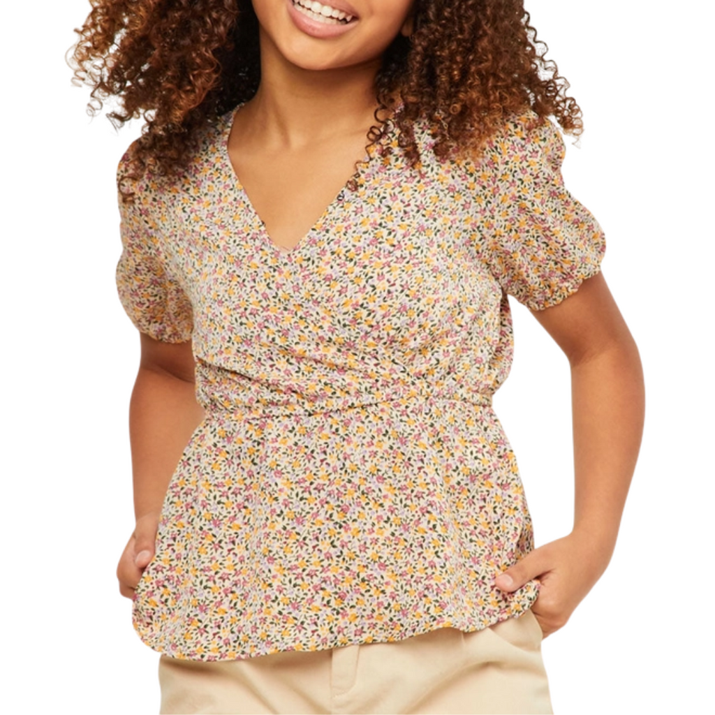 Sweet allover floral print in blush, pink, yellow, and green hues