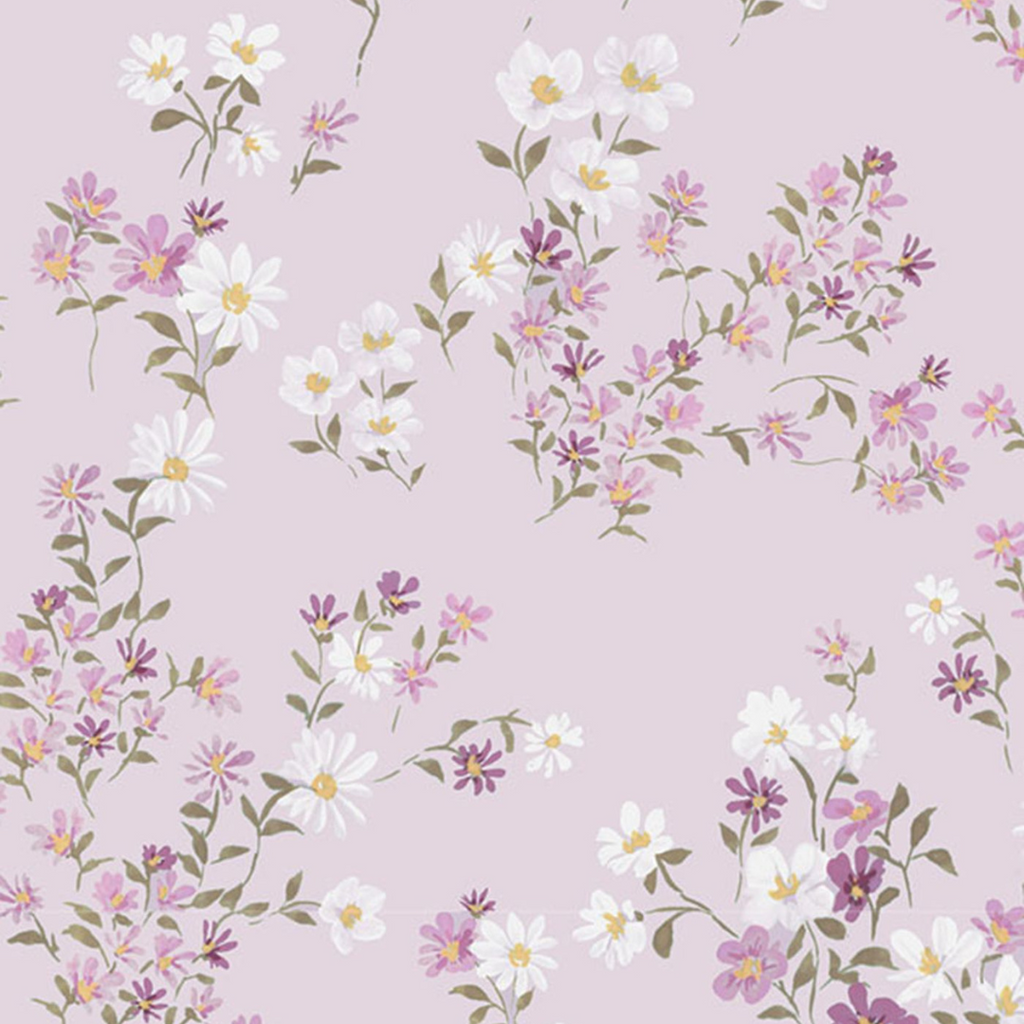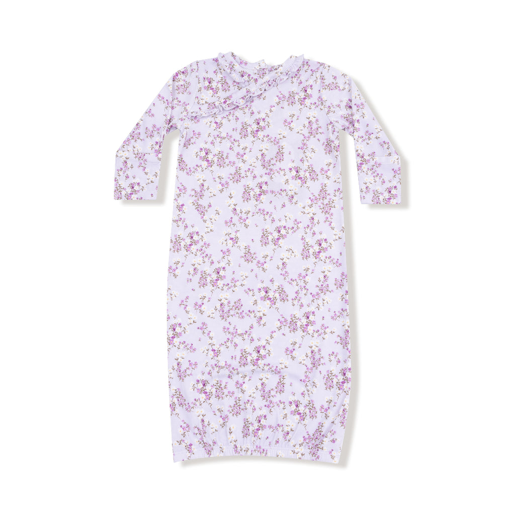 Lavender floral print with delicate ruffle trim and kimono-style neckline