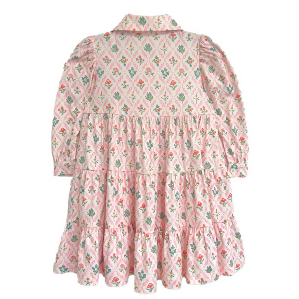 • Adorable long sleeve tiered dress in a charming pink floral pattern