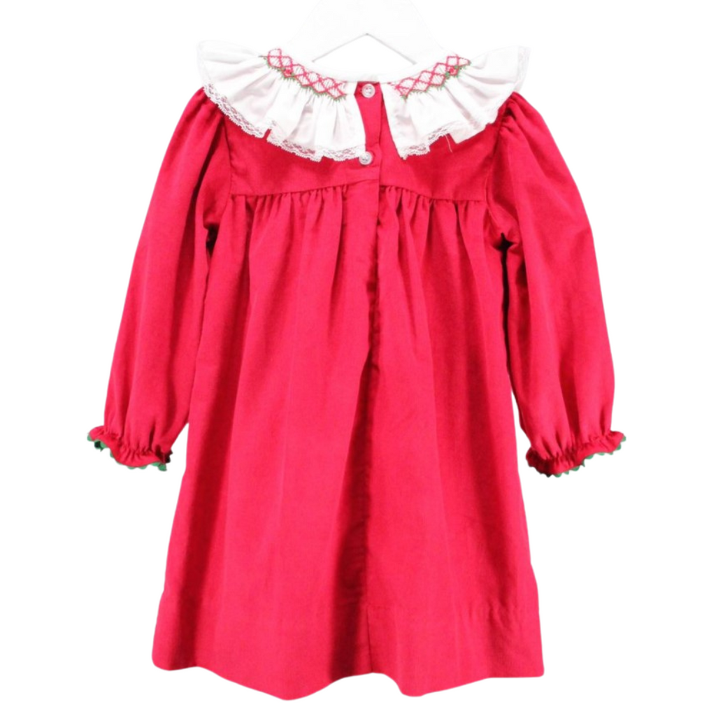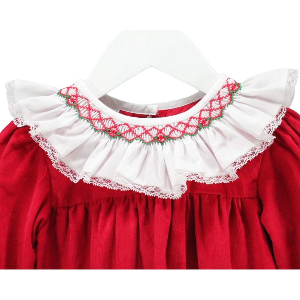 Classic red corduroy long sleeve dress with festive white ruffle collar