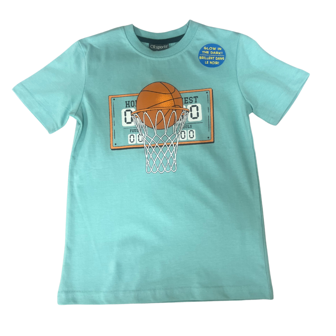 - Sporty Design: Teal Basketball Hoop Shirt featuring a dynamic basketball going through the hoop.
