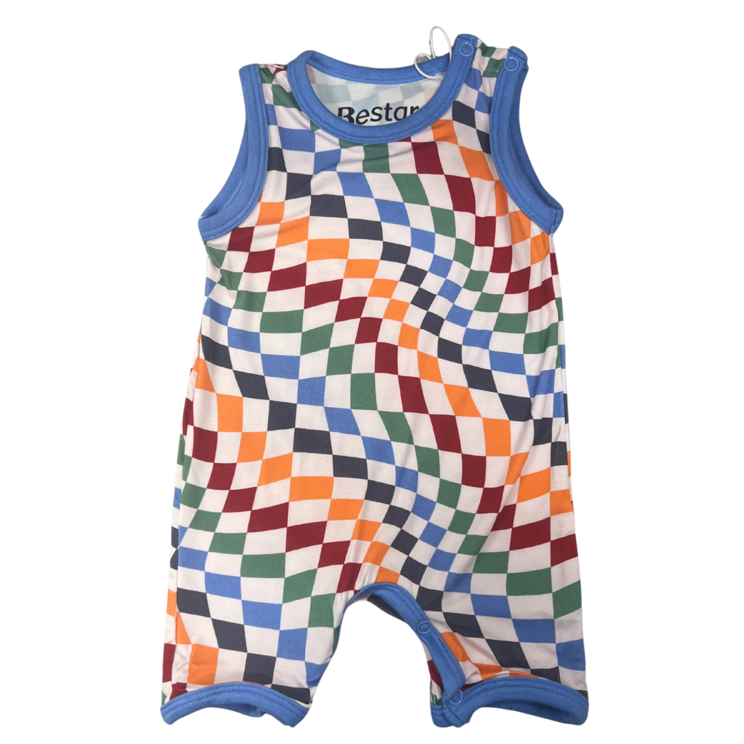 Twisted Checks Bold Shortall with a wavy multicolor checkerboard design and snaps at the shoulder and crotch.