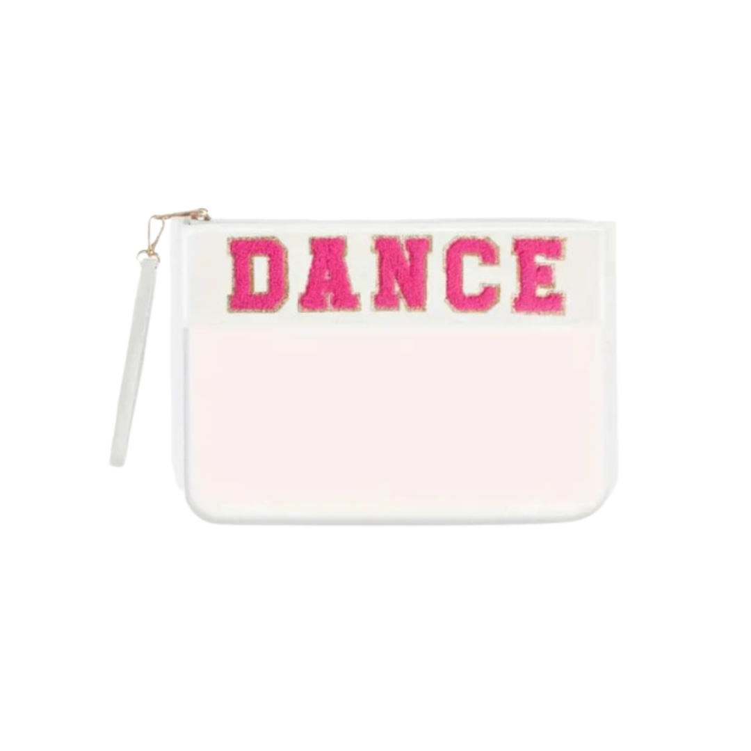 White and clear zippered pouch with bold “DANCE” chenille letters